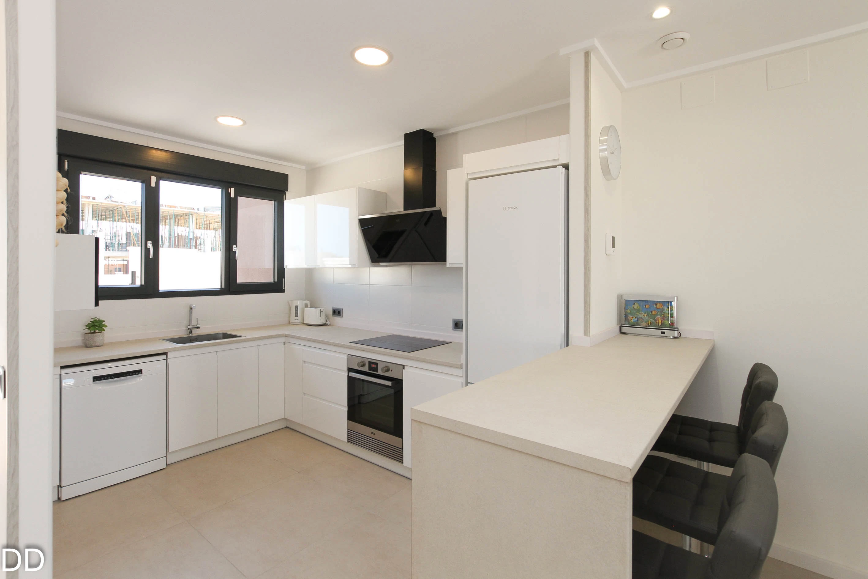 MODERN HOUSE WITH POOL.Newly built villa in Vergel area 1.5 km from the beach of Las Marinas, close to all services and the shopping center. The house is developed on two floors and access to it is through a porch that leads to an entrance hall from which you can access frontally to the living room, laterally to a toilet, a laundry room and the access staircase to the second floor, and on the opposite side of the access to the kitchen. In front of the entrance hall we find the living room from which you can access a covered terrace. On the upper floor we find three bedrooms, one of them with bathroom and dressing room and a second bathroom that serves the other two rooms.This unit has a plot for exclusive use of 202.21 m², on which it sits and on which is the space reserved for vehicle parking and an outdoor pool of 18 m² of water surface. It is a modern house with quality and style finishes, the kitchen is fully equipped, the house is ready to move into.